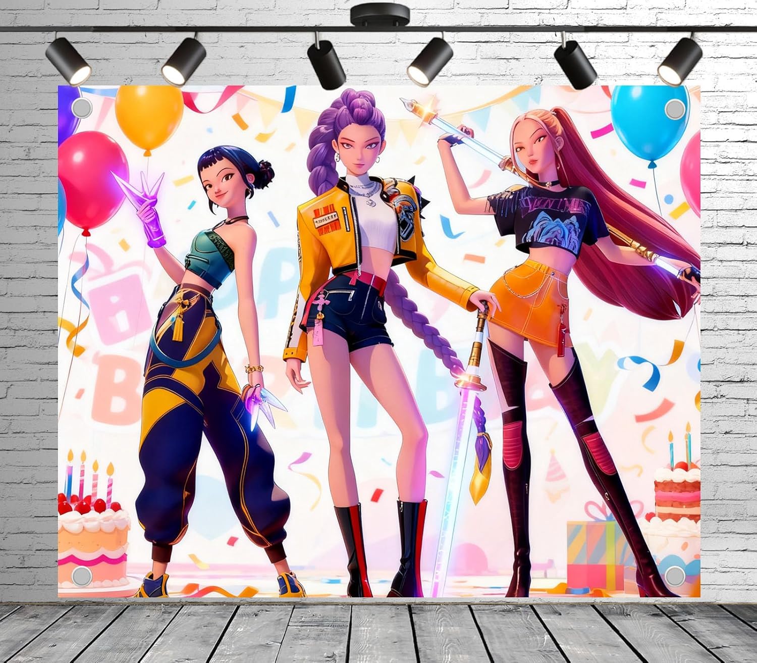 DUS Demon Movie Hunters Happy Birthday Backdrop | Polyester Fabric Korean Idol Theme Style Banner for Kids Cosplay Party Photoshoot Background Anime Fans Hoom Decor Studio Props(5x4ft)