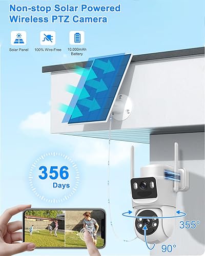 【Solar Powered & 5GHz/2.4GHz WiFi】The wireless security camera outdoor is equipped with a 10000mah rechargeable battery and solar panel to ensure 365 days of uninterrupted power supply. Supports both 2.4GHz and 5GHz WiFi for a more stable and faster connection, reducing lag and disconnection issues.