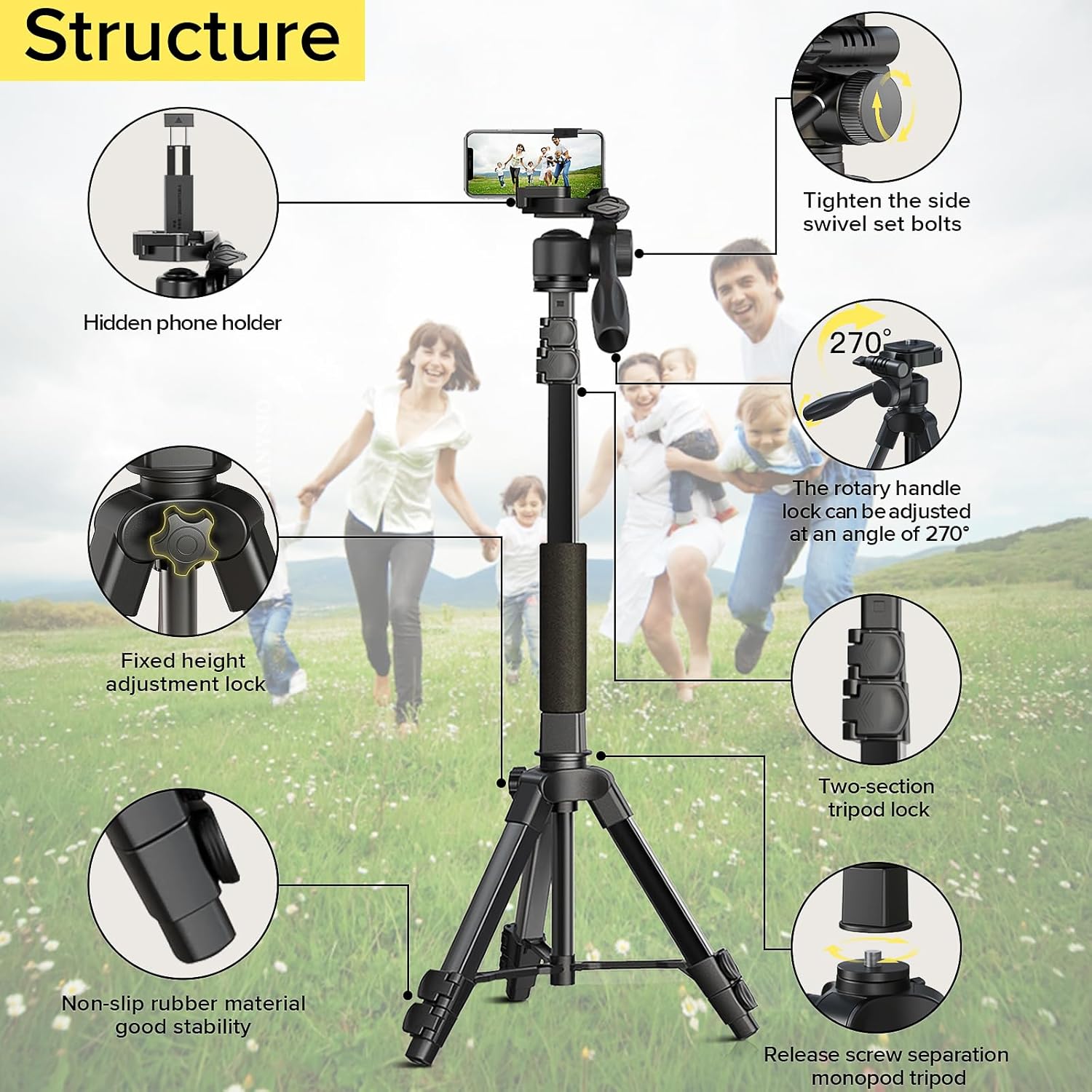 【Tripod for All Camera and Phone】Standard 1/4" screw mount compatible with all cameras ( Canon, Nikon, Fujifilm, Olympus, Panasonic), DSLR, SLR, and digital cinema cameras, also spotting scopes, projector, compact camcorders, binoculars. The 360° phone mount is compatible with iPhone 15 14 13 12 11 Pro/XS/XR/MAX/8/8 Plus/X/7 Plus/7/6s Plus/6s/6 Plus/6/Samsung Galaxy S22/ S21 Series/ Galaxy Z Flip/ NOTE/ One Plus 1+Series