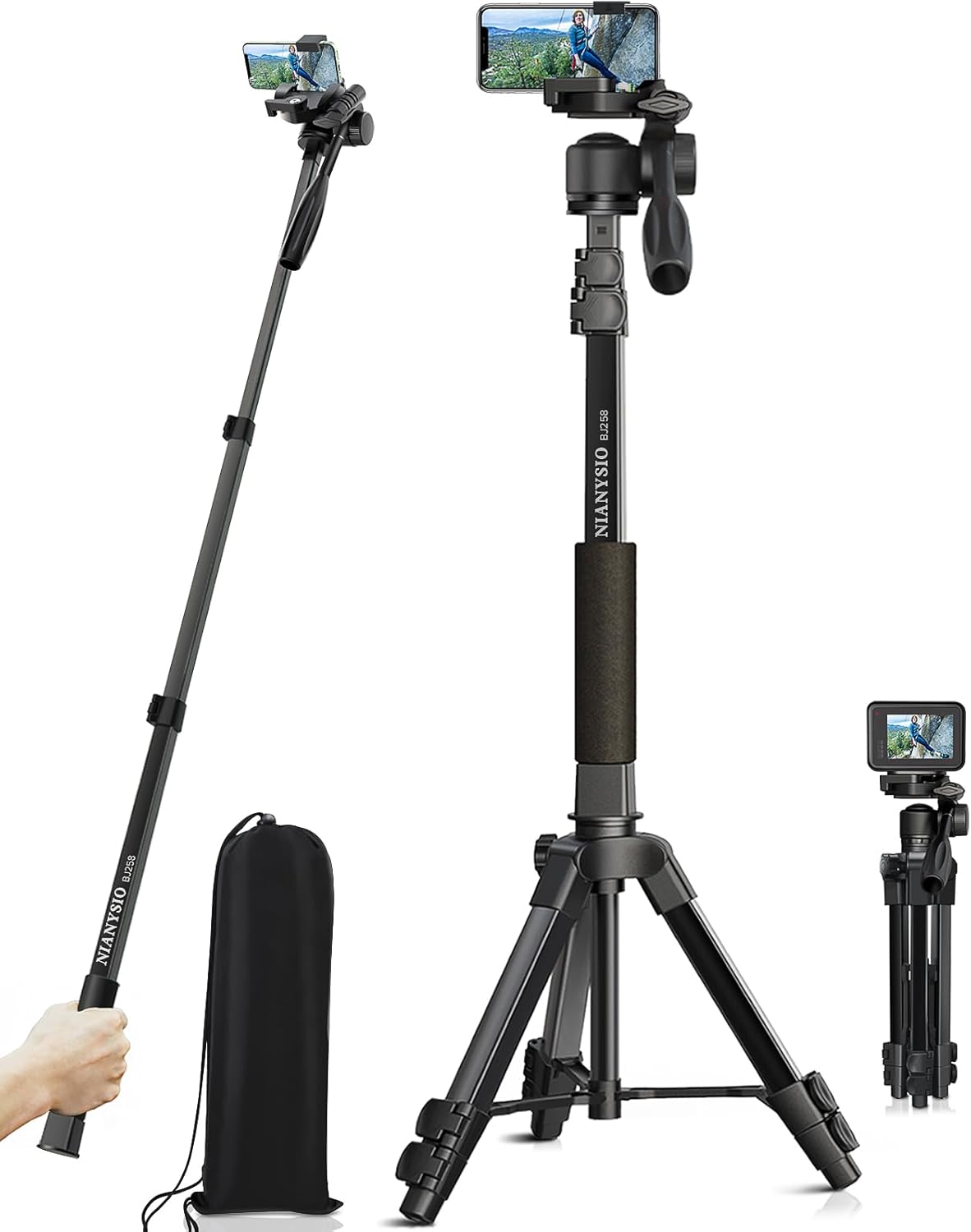 【Multifunctional Three-way Pan/Tilt】NIANYISO Tripod has an exclusive patent and is equipped with a quick release plate, It can convert a camera tripod to a phone tripod without installing anything. Simply pull out the built-in buckle of the pan/tilt, it can be used as phone tripod. 360°rotating, adjustable-angle pan/tilt allows you to take panoramic photos/videos at will. Camera tripod has a 360° rotation function, allowing tilt and rotation movements; portrait or landscape options